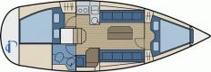 - Cabins / layout of the boat: aft cabin, bow cabin, salon, head, outside steering position, steering position on quarterdeck