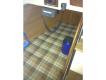 - A raised deck with 7' beam allows a surprisingly roomy cabin. Arrangements below deck are comfortable for an overnight or weekend outing for two adults. There is a large, comfortable V: berth forward with a portable head between; smaller port and starboard quarter berths aft are not large enough for adults. A sink, icebox and small Hibachi charcoal stove with stainless chimney are located on the port side of the cabin; an Origo alcohol stove is to starboard. Storage is excellent with nine bins beneath seats and berths. Wood trim and joiner work below produce an attractive interior.