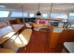 - Main cabin: center teak drop leaf table; teak storage cabinets above both port side galley sinks & starboard settee.