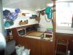 - Sleeps eight in three staterooms and convertible dinette. Matched double (6'6"x 48) berth staterooms in aft of each hull. Main salon in center of boat with chart area and storage to port, U: shaped dinette with seating for six to eight in center over bridgedeck and galley to starboard. Dinette converts to a double berth. Forward on port is the head/shower area with a folding Plexiglas door separating the shower area from the head. Forward on starboard is the master stateroom with a standard queen berth (6'6"x 5'4")over the forward bridgedeck area. Large polycarbonate windows provide ample light and give the interior an open an airy feeling. Stratipoint Teak & Holly floorboards cabin soles and abundant teak trim provide a warm interior feel.