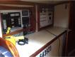 - Aft to Galley: Counter 7' 6" long x 19" wide, with Formica work top, counter on opposite side, 3 drawers, and storage under surface. Propane stove with two burners, oven and broiler. 4 Cu. Ft. Refrigerator operates on automatically on propane and 115 volt. Storage areas opposite with sliding doors. 12 Volt fluorescent light, 115V outlet.