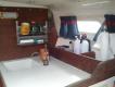 - The main salon has a u: shaped settee with a unique 3 piece table that folded is great for lounging in the settee. With one panel open it is a functional work surface to dining for two. Both leaves open provides comfortable dining for 6. To Starboard is the automatic 4 cubic foot refrigerator with counter above. To Port is a seat with storage underneath. Above are 12 volt and 115 volt breaker panels, VHF, flammable gas detector and Stereo. The main salon is bright and airy with the 2 hatches above, forward openings to the windows in the master stateroom, windows port and starboard, the cockpit door and 2 opening windows aft.